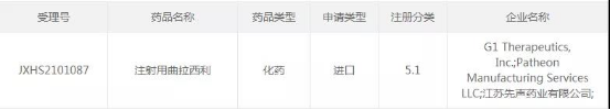 2021年11月29日,国家药品监督管理局受理了先声药业提交的注射用曲拉西利(英文通用名Trilaciclib)的境外生产药品注册上市许可申请,拟在接受含铂类药物联合依托泊苷方案的广泛期小细胞肺癌(ES-SCLC)患者中预防性使用,以降低化疗引起的骨髓抑制的发生率,标志着乐城临床真实世界数据应用试点工作取得了新成效。